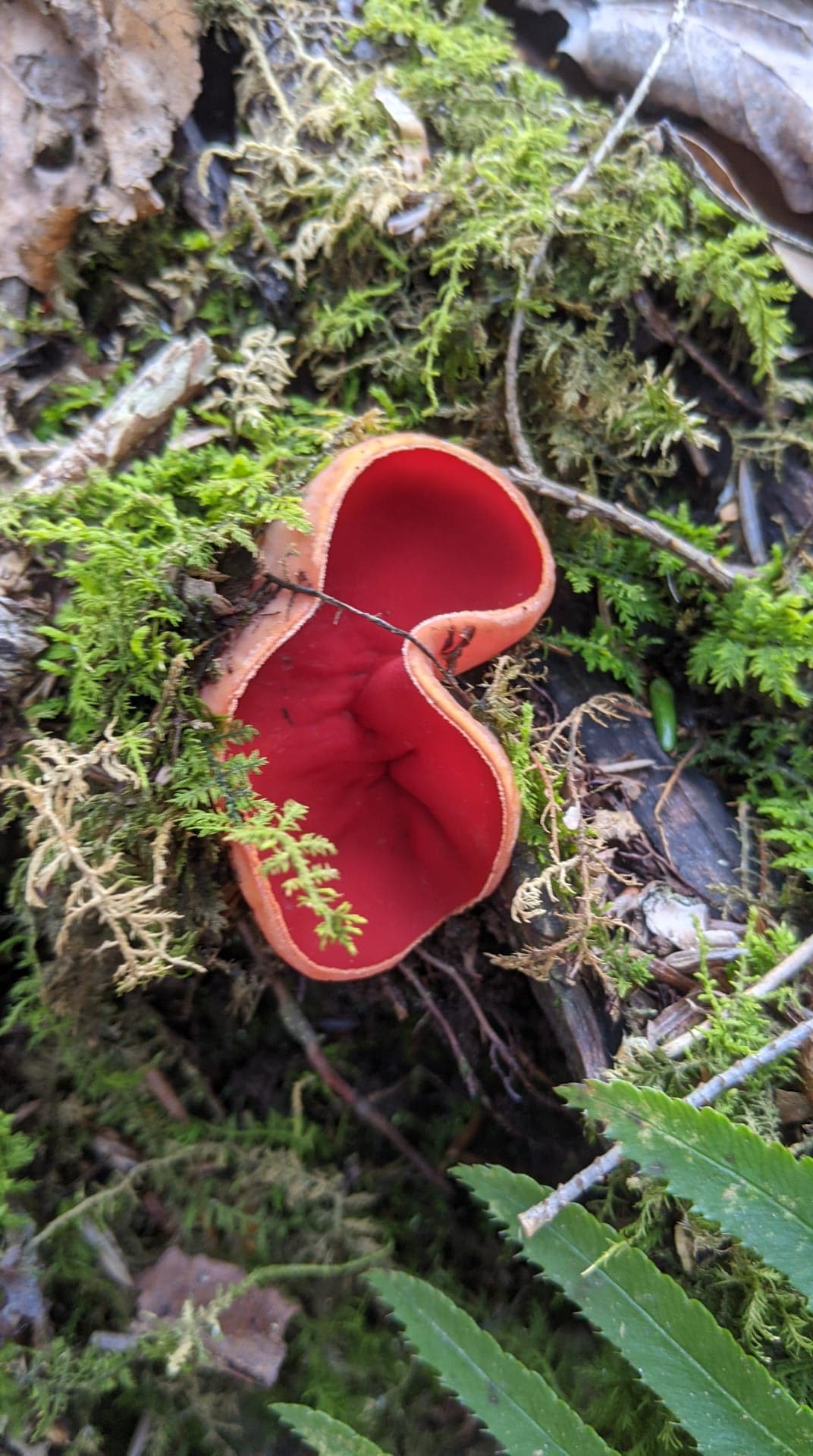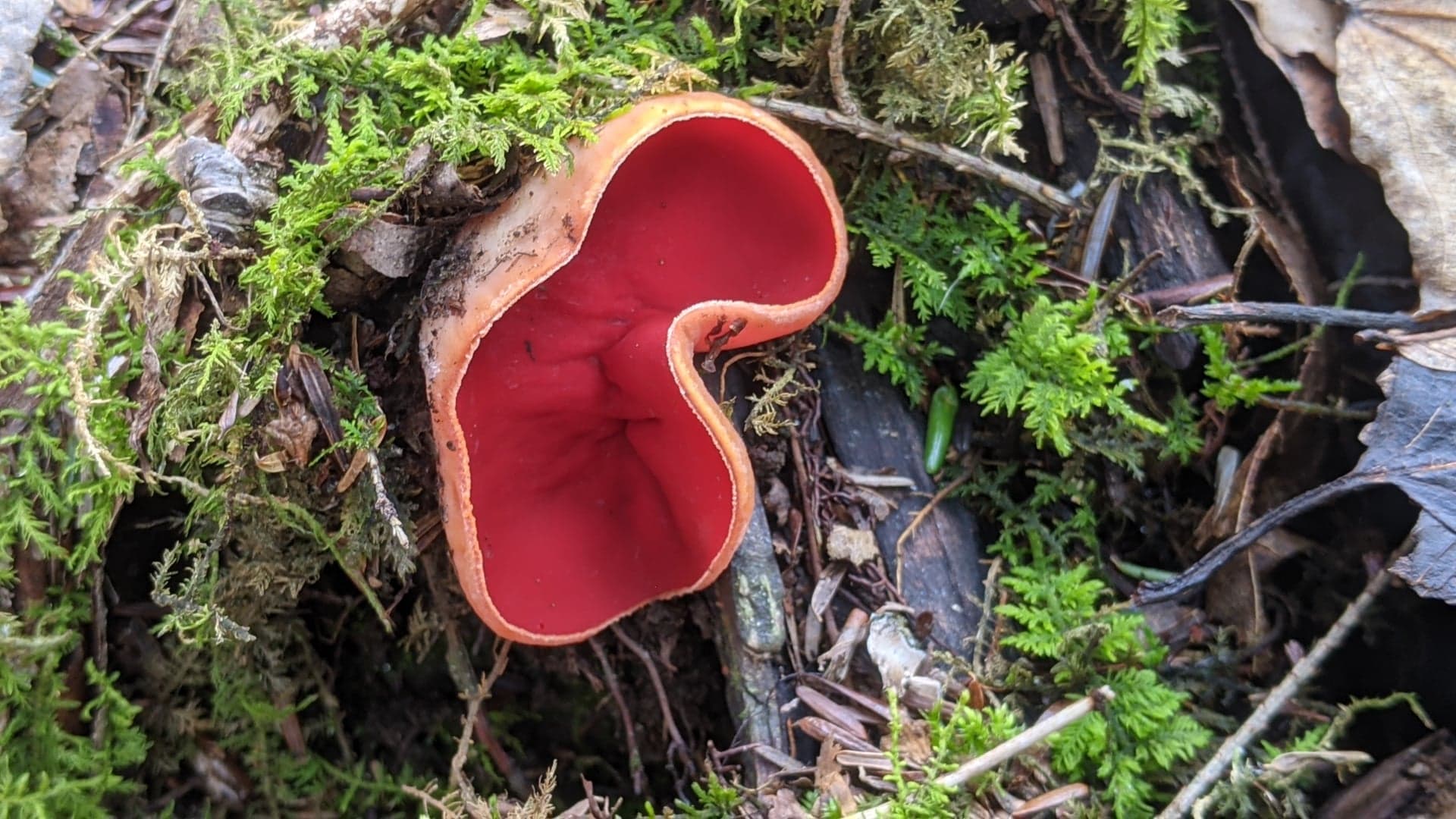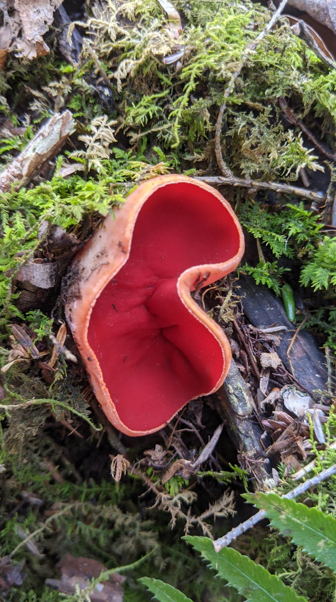 The scarlet elf cap is found all over the world from Canada to Australia to Africa. It is found on decaying sticks and branches in damp areas. Often slightly buried under the leaf litter or tucked into some moss.