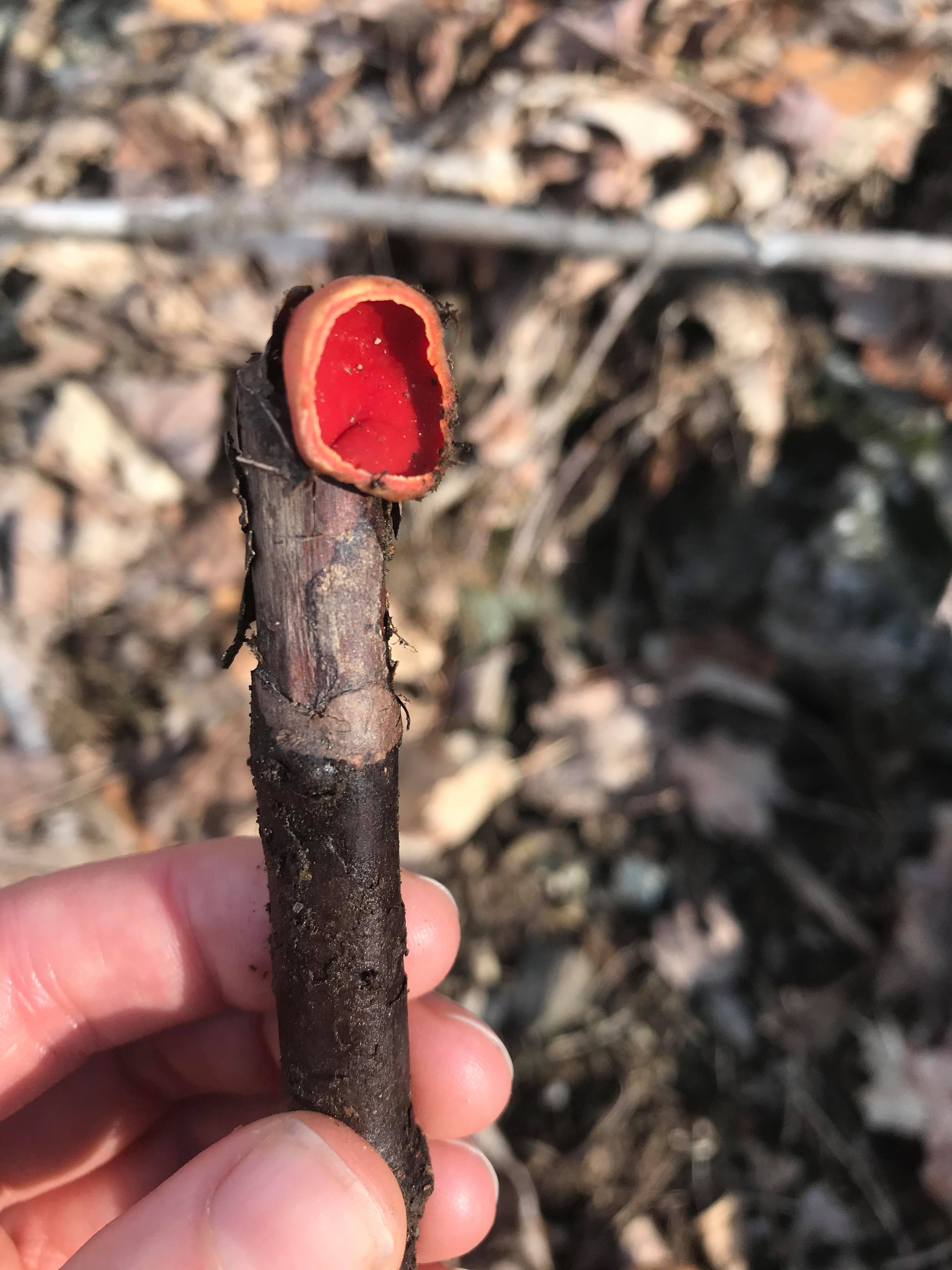 The scientific name of this fungus is Sarcoscypha coccinea. The genus Sacosycpha are cup shaped fungus and the name comes from the Greek word for a drinking bowl. Common names for this mushroom are few, and are limited to Scarlet Elf Cup or Elf Cap.
